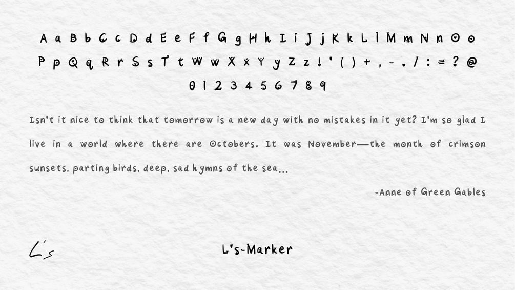 L’s-Love is a handwritten display font full of charm and playful spirit. With cute little heart-shaped quirks and an easygoing, slightly wobbly flow, it brings warmth and humor into your designs — perfect for love notes, birthday cards, cozy quotes, and illustrations that just need a little extra smile.